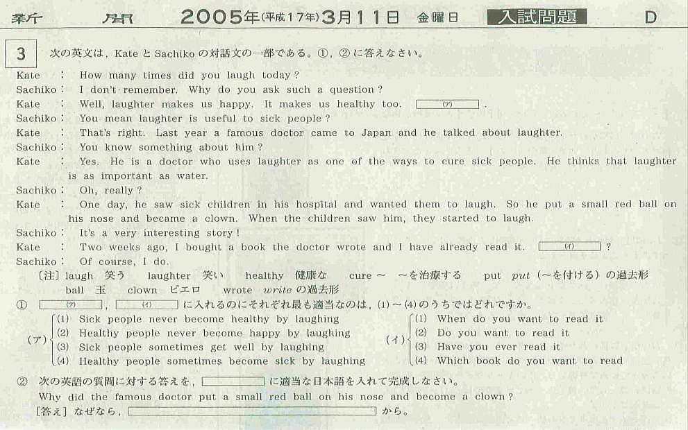 平成17年の岡山県立高校の英語入学試験問題です。笑いの効用とともに頭の体操にどうぞ。